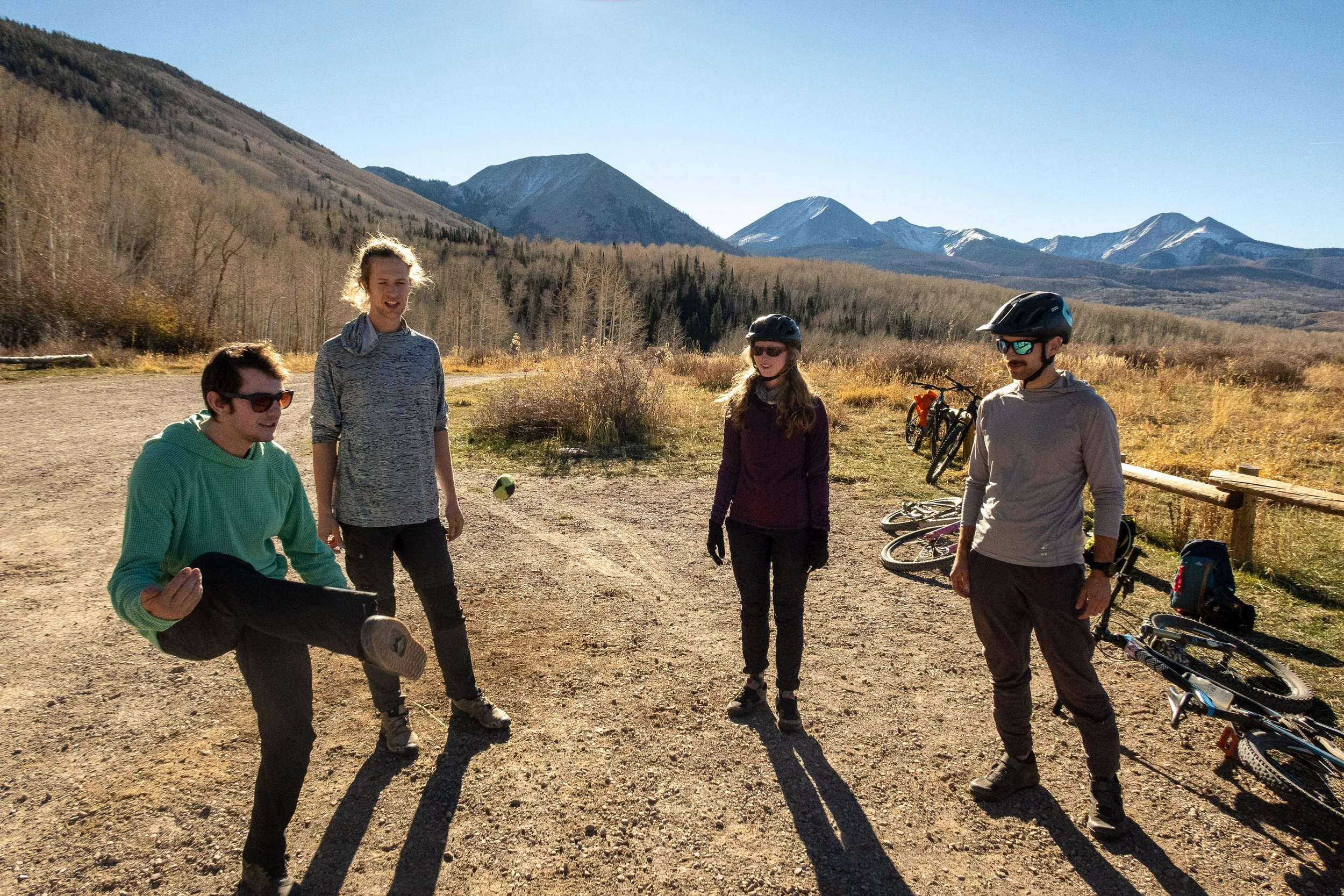 Any time Adam is involved, the hacky sack comes out, here for a pre-ride warm up at the trailhead.