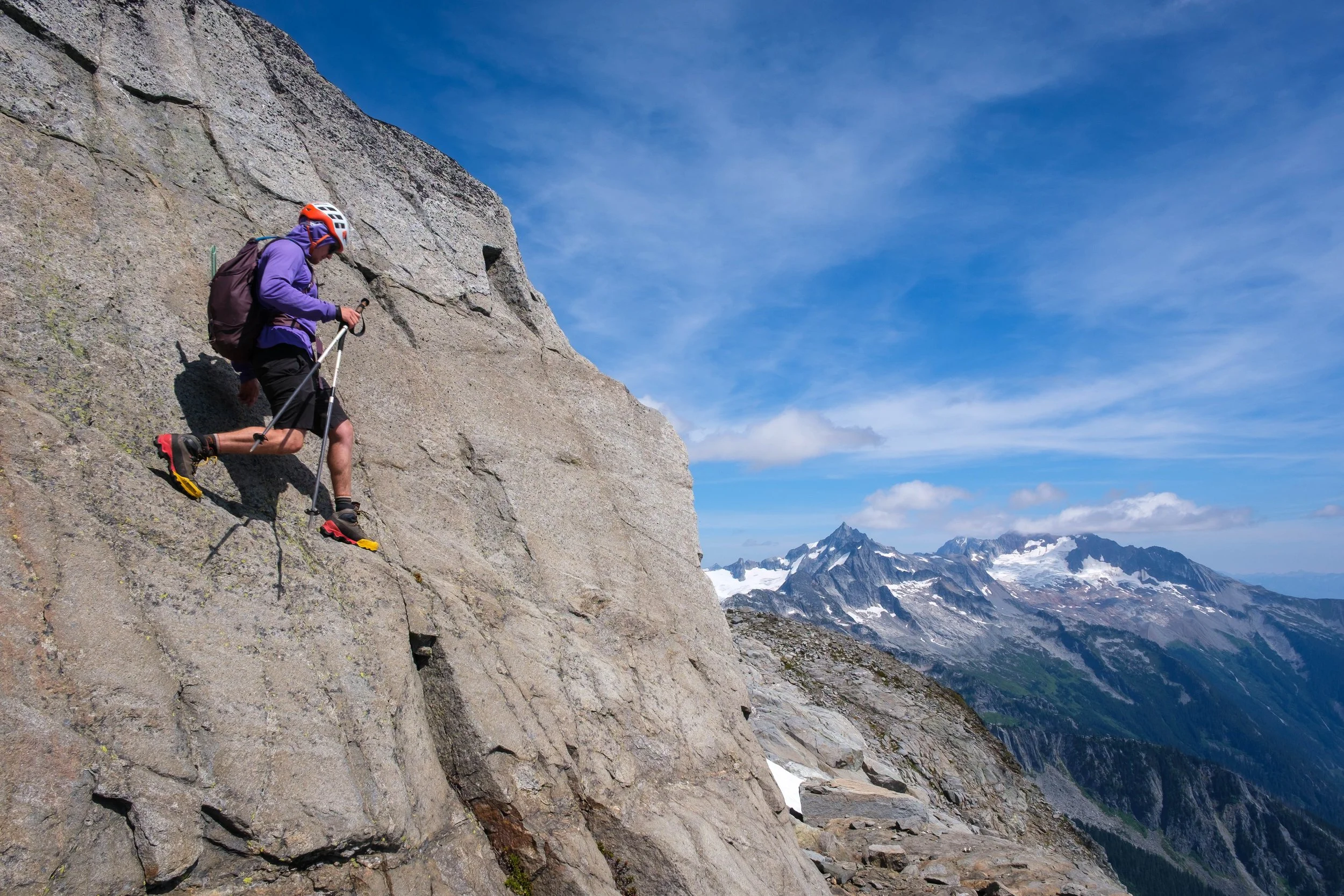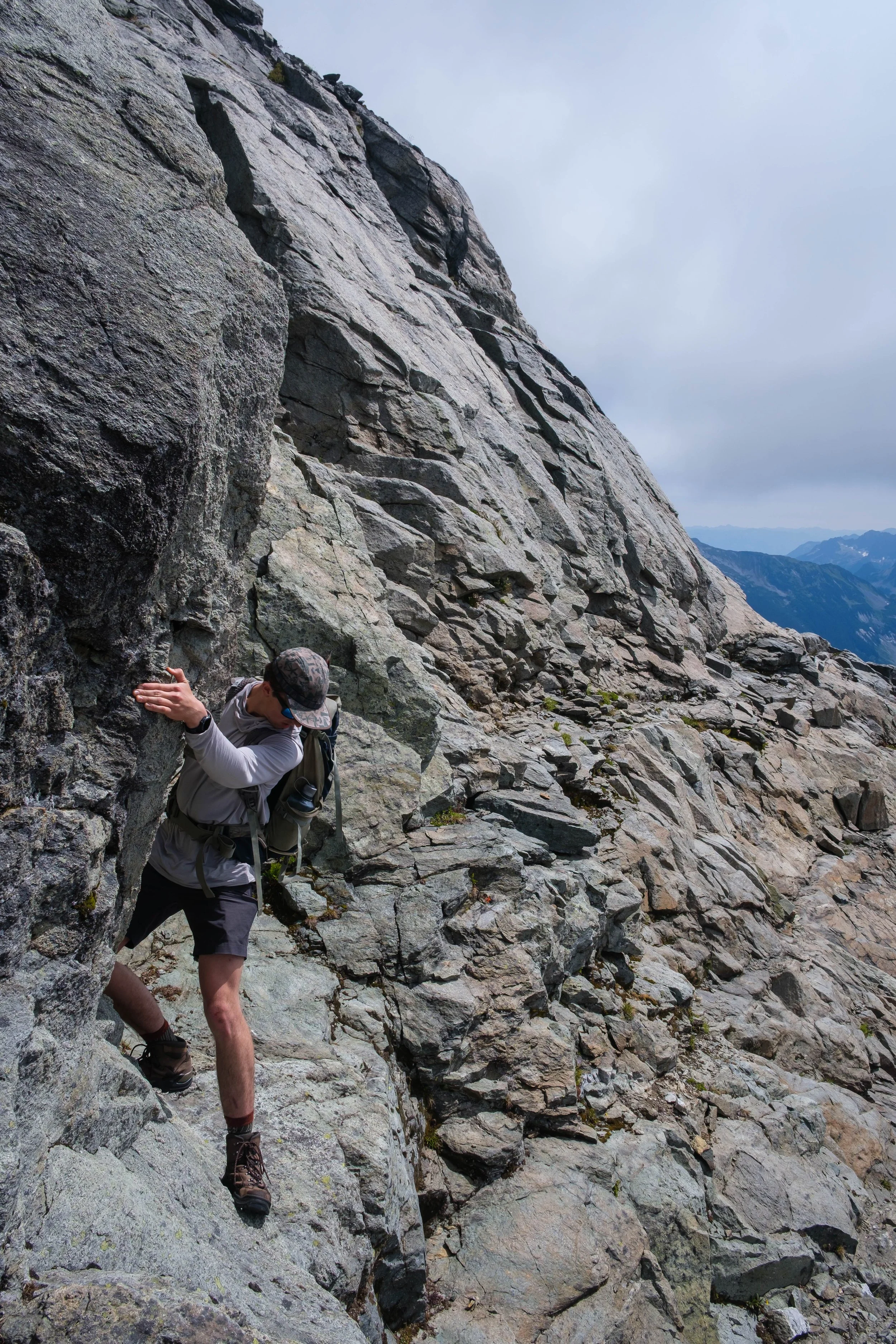 Adam descending easy slabs towards the bottom of the scramble, with Forbidden in the distance, and Boston/Sahale in the clouds.