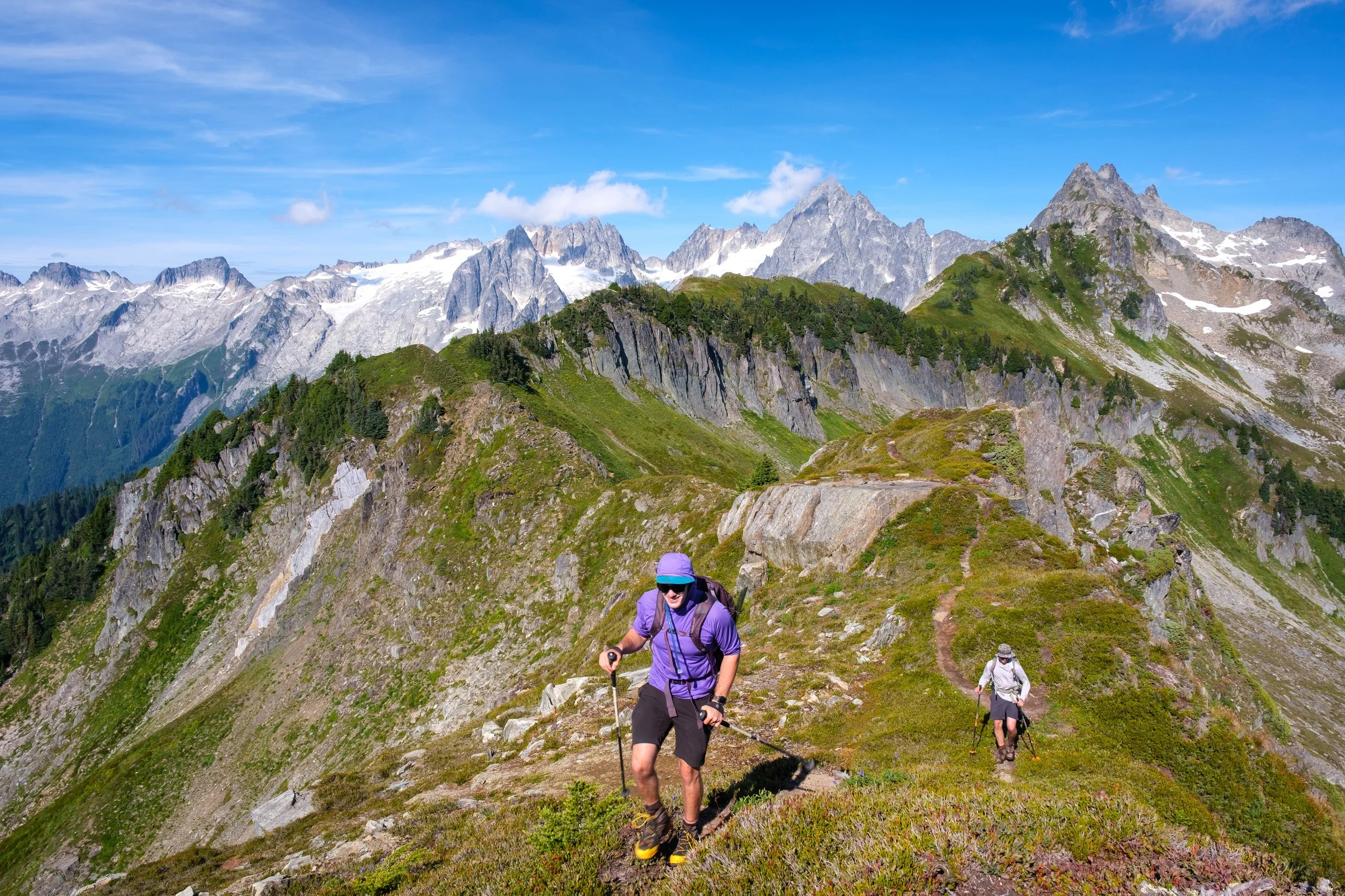 By 6:30 or so, the sun was high enough in the sky that the light was starting to get flat. I knew that Adam and Shawn were planning on leaving Seattle around 5am, but I figured it would still be a few hours before they made it up to the ridge. On the hike in, I had floated grand plans to go tag the summit of Hidden Lake Peaks, or to hike down to the trailhead and join them for their hike up, but all those ideas fizzled out when confronted with my own laziness. In the end, I climbed back into my bivy, and went back to sleep, knowing that the boys would practically have to step over my sleeping body to continue further along the ridge. I eventually woke back up around 9:30, and made myself some breakfast before packing up. A few minutes later, I spied two figures strolling along the ridge, and Adam and Shawn popped up, having made great time up the trail after battling their way up the Sibley Creek road in Adam’s VW Golf.