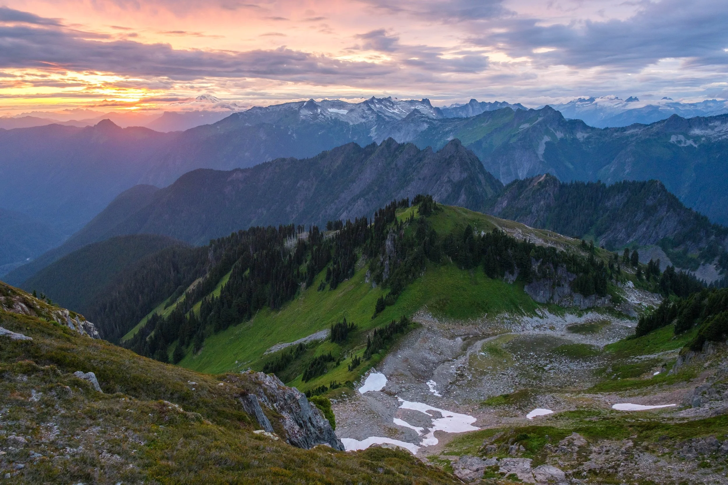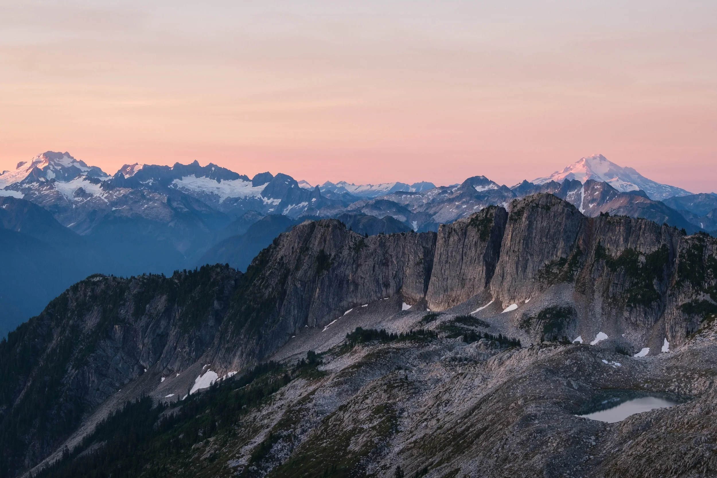 Sunset from the ridge above Sibley Pass, looking down the ridge that divides the two forks of Sibley Creek. Baker, Little and Big Devil, and the Southern Pickets in the distance.