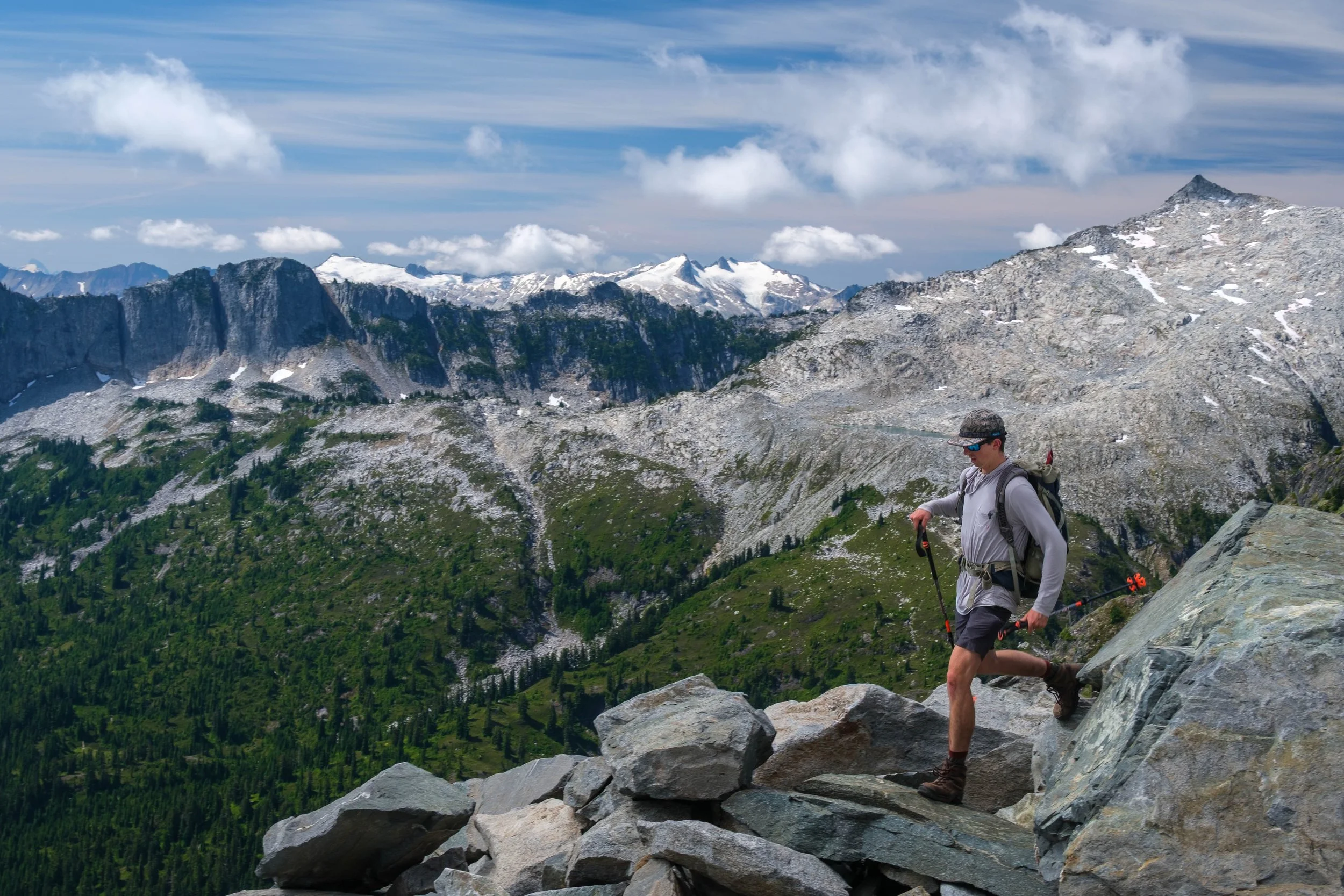 Shawn boulder-hopping with a lovely view of Mutchler, Snowking, and Hidden Lake Peaks.