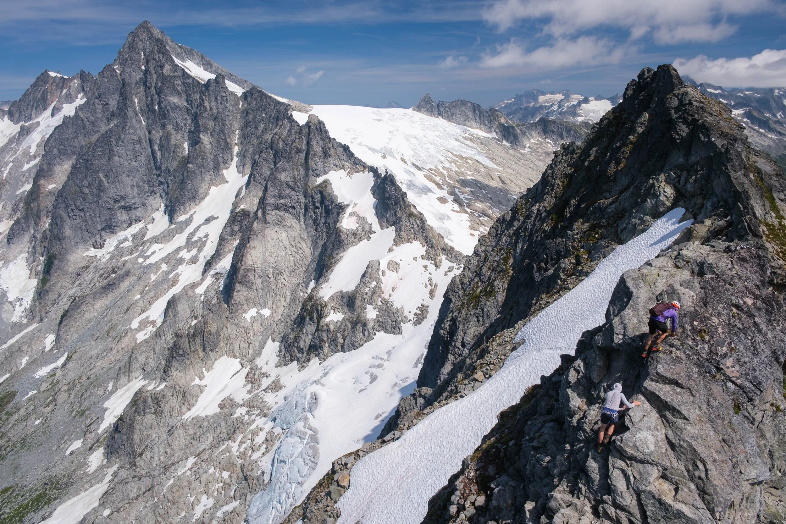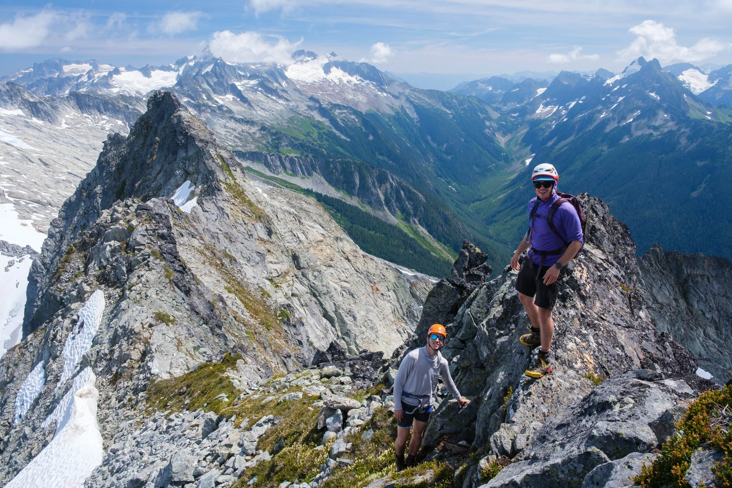 A short segment of downclimbing on the ridge crest, with amazing views of Eldorado. The East Dick is the shaded summit above Shawn and Adam.