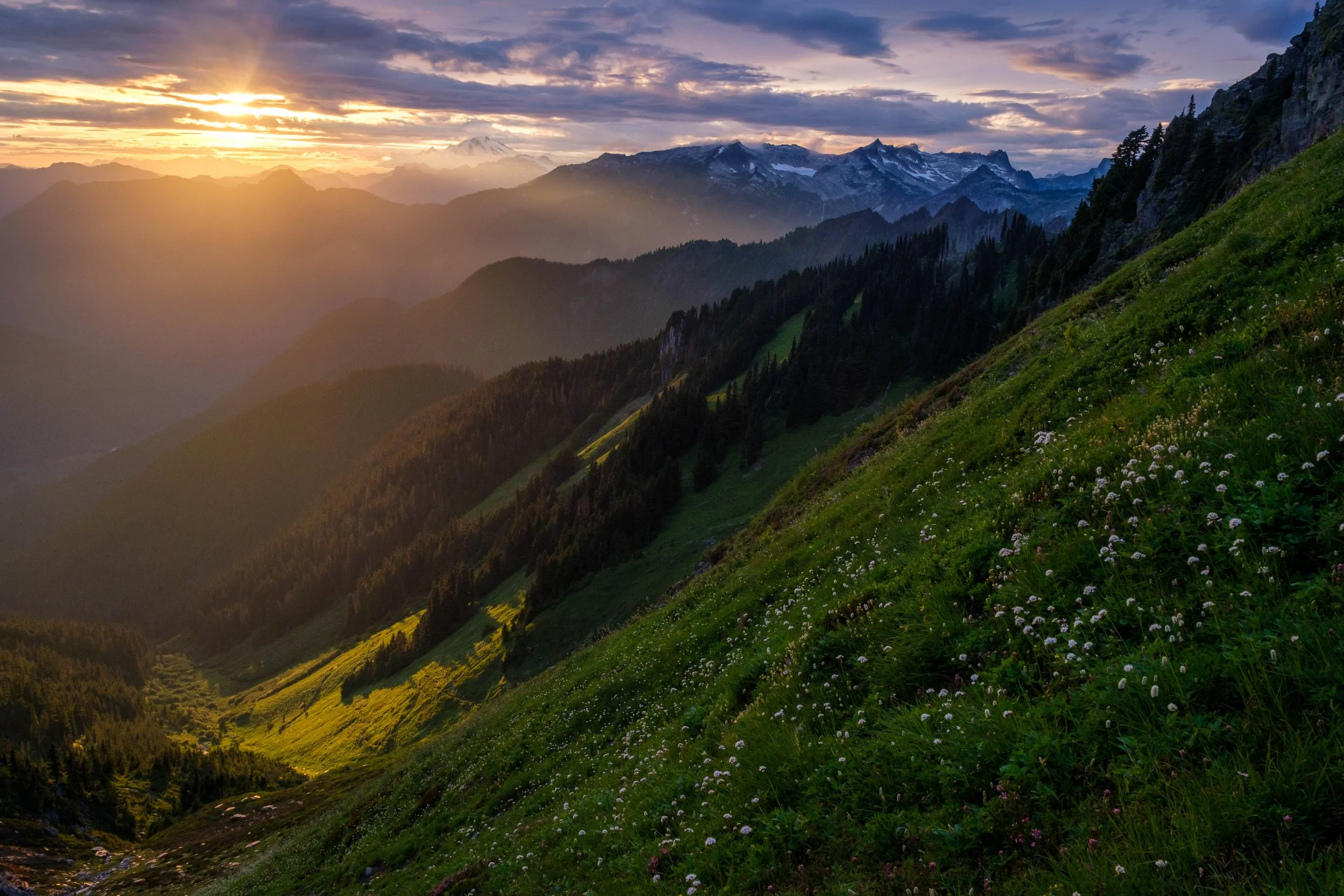 The setting sun bursting out of the clouds, high above Sibley Creek. Mount Baker to the right, along with Little Devil.