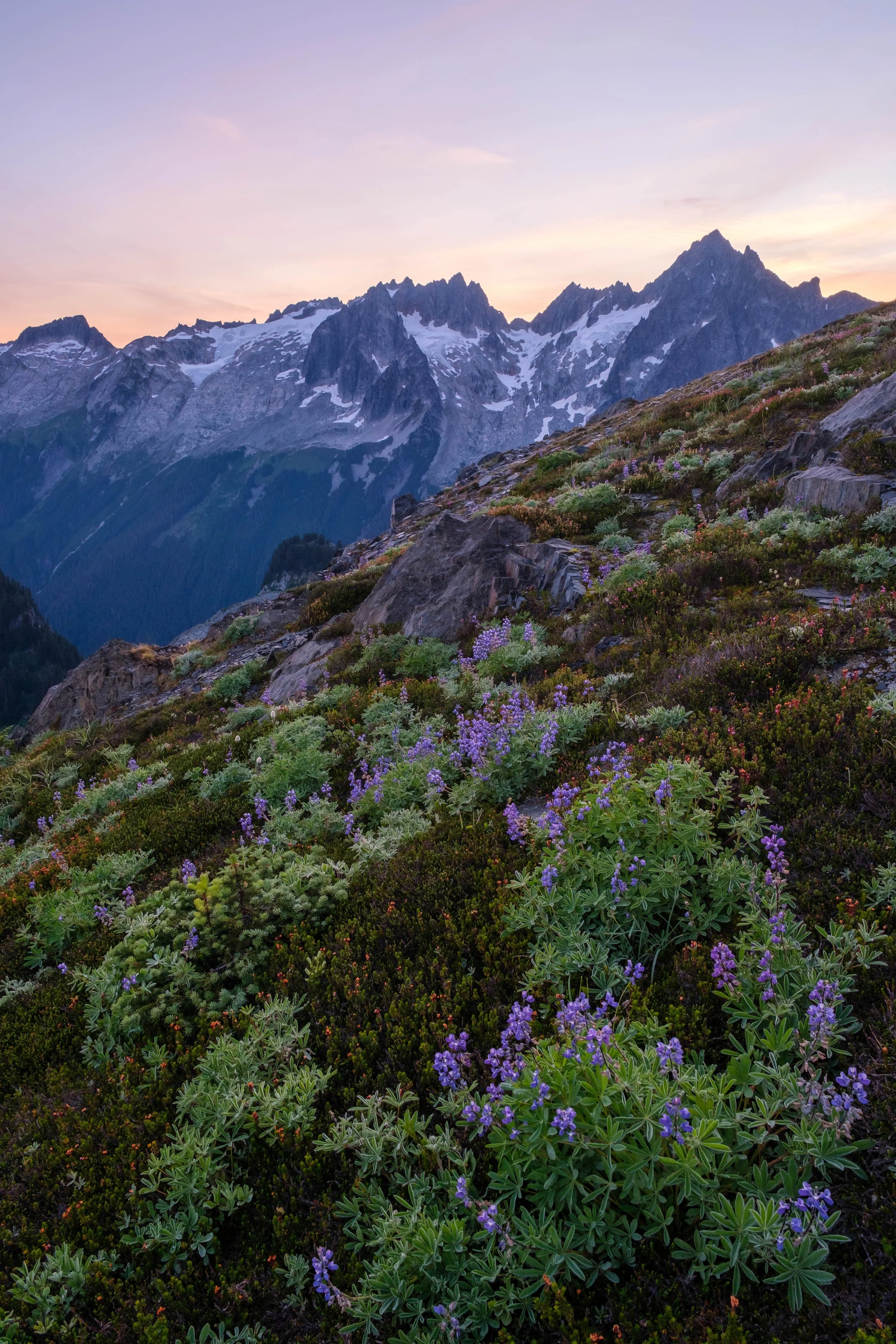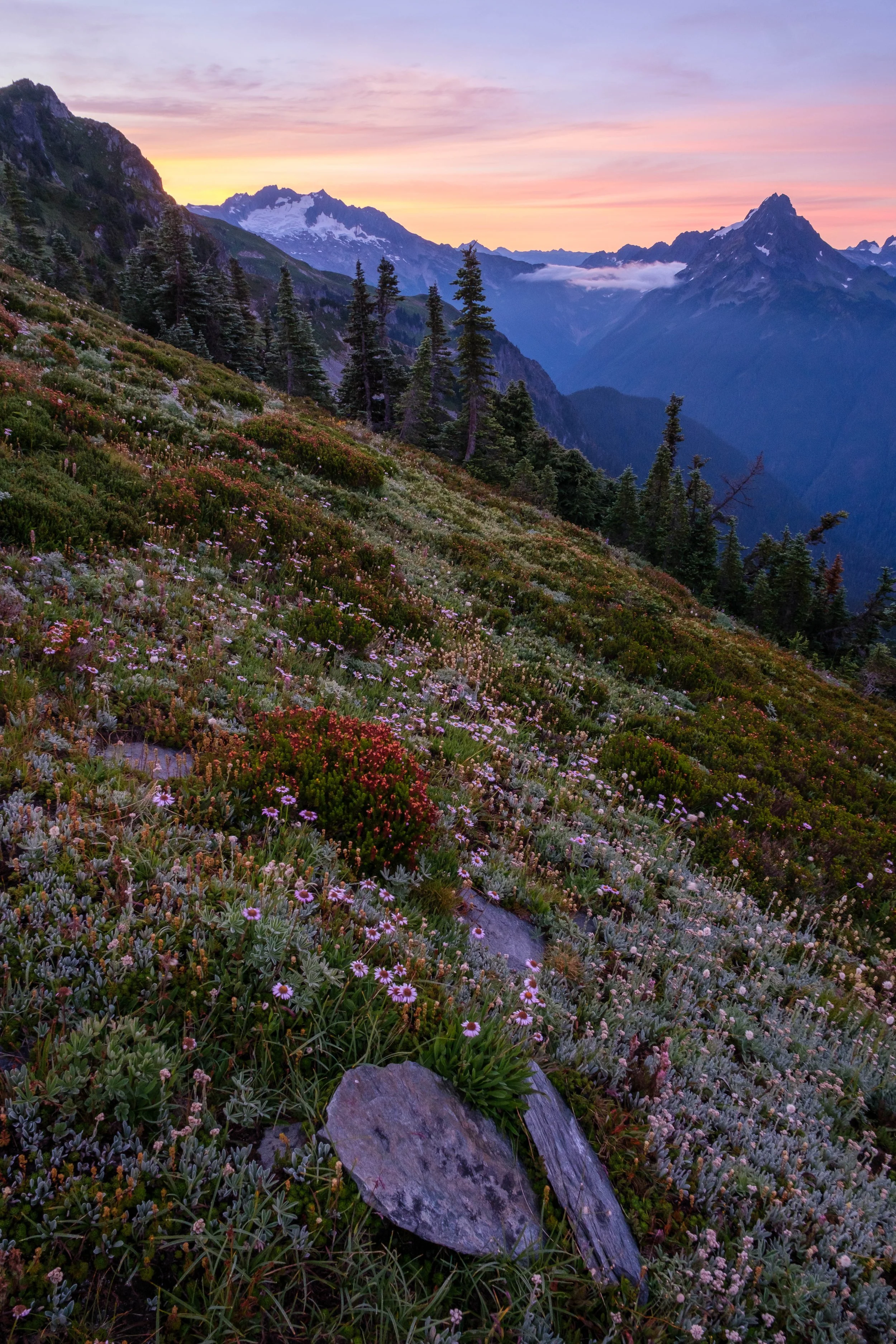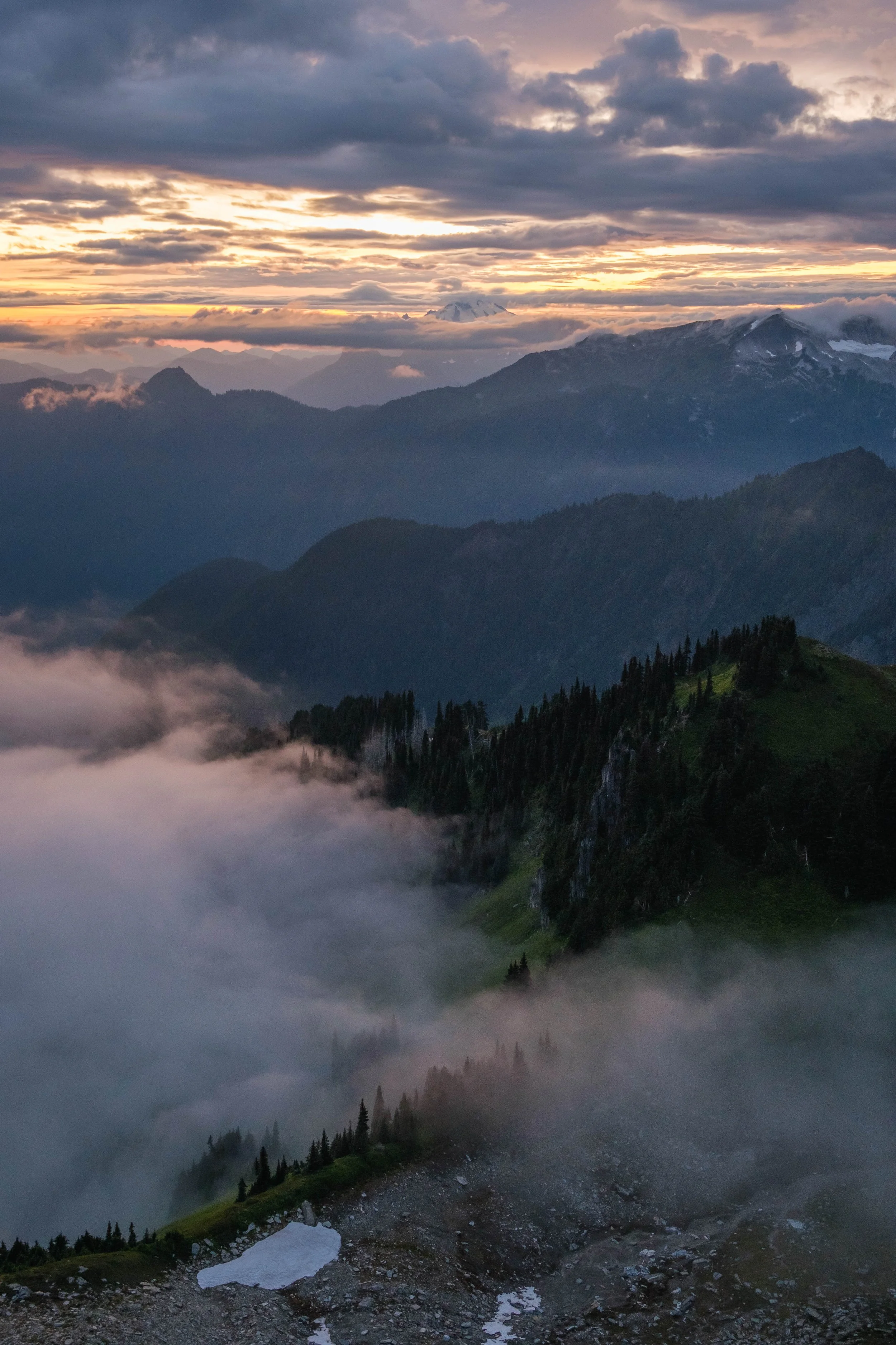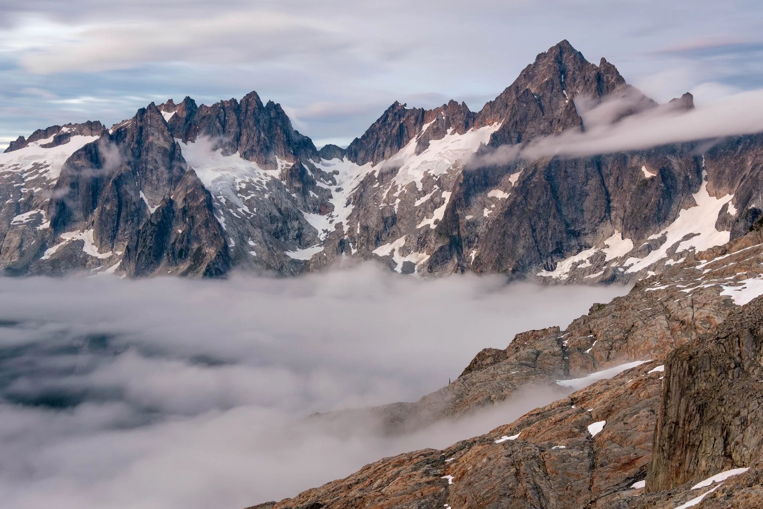 I frantically snapped photos as the sun dodged clouds near the horizon, and made my way along the stunning and steep heather ridge, following a climbers’ path. The views were stunning, with dramatic clouds to the west, and pockets of sunlight on the Cascade Pass peaks to the east. It was a shame to not have been there 30 minutes earlier, but I had a great time snapping photos in the fading light. After sunset, broken clouds formed in the valleys below me, and blew along the ridges. Having forgotten my tripod (oops!) I balanced my camera on a rock to take a long exposure of the clouds forming on the dramatic West Face of Eldorado before getting out my bivy sack for a cozy night.