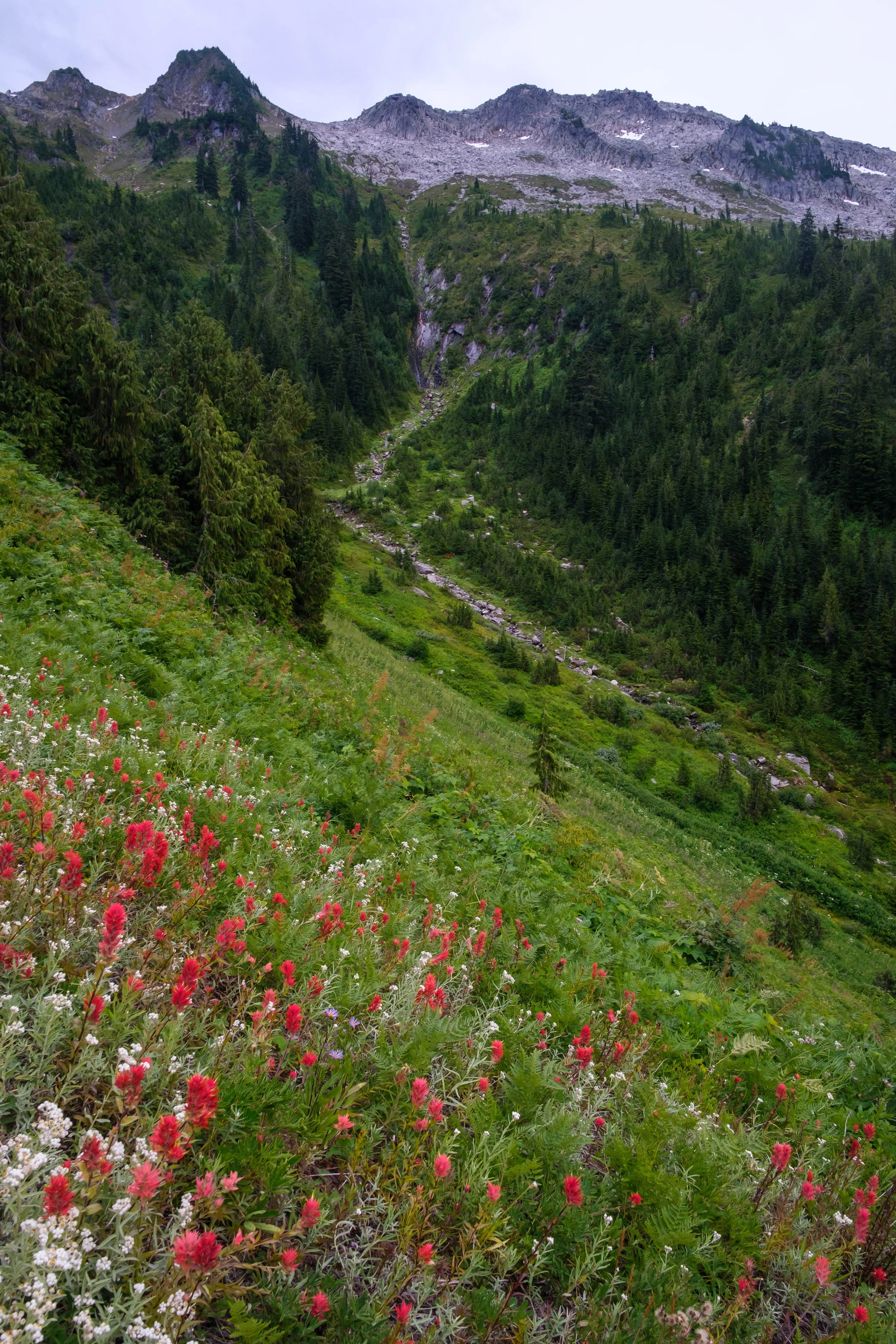 Paintbrushes below overcast skies and Hidden Lake Peaks.