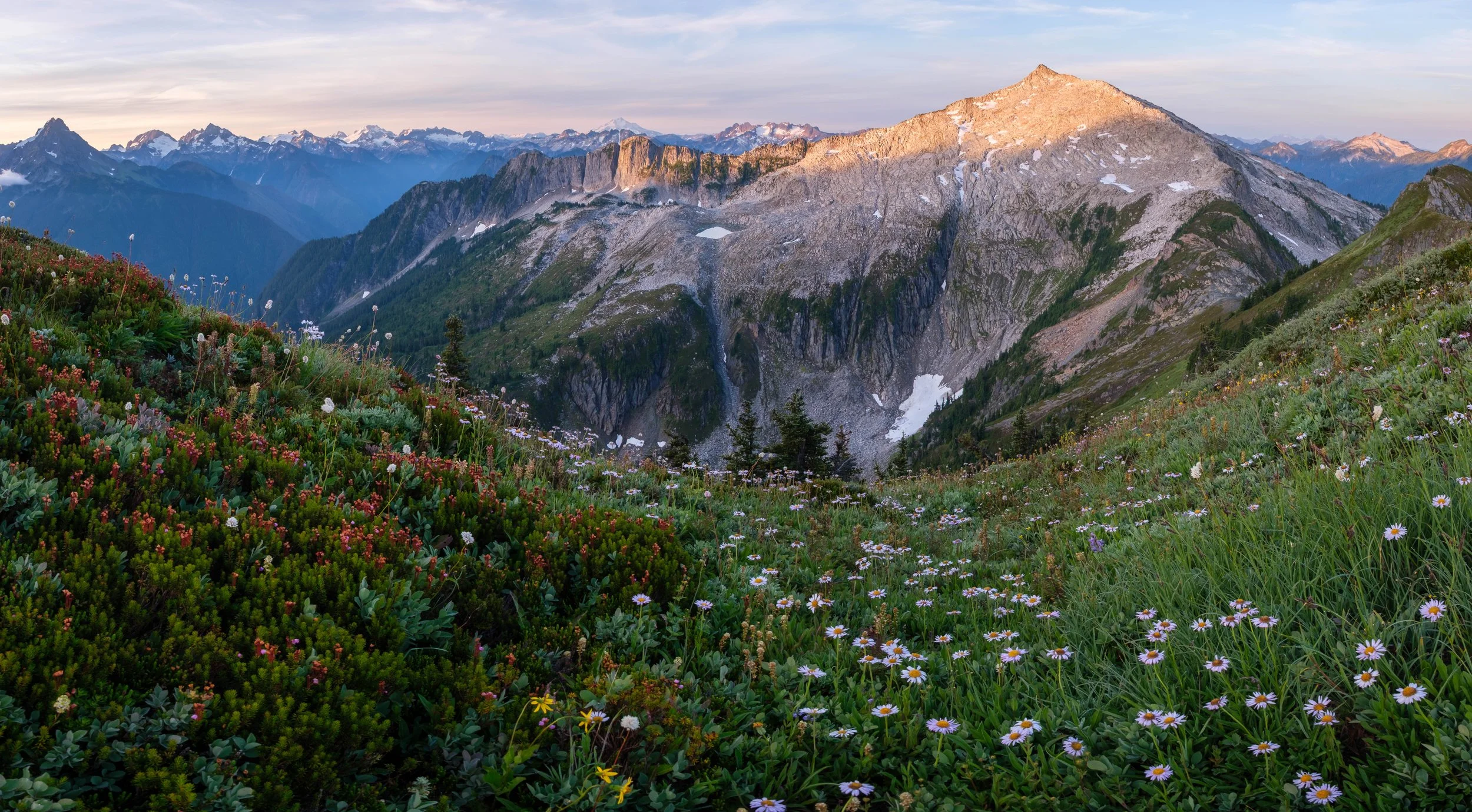 Morning light on Hidden Lake Peaks’ highest summit, with lovely asters in the foreground.