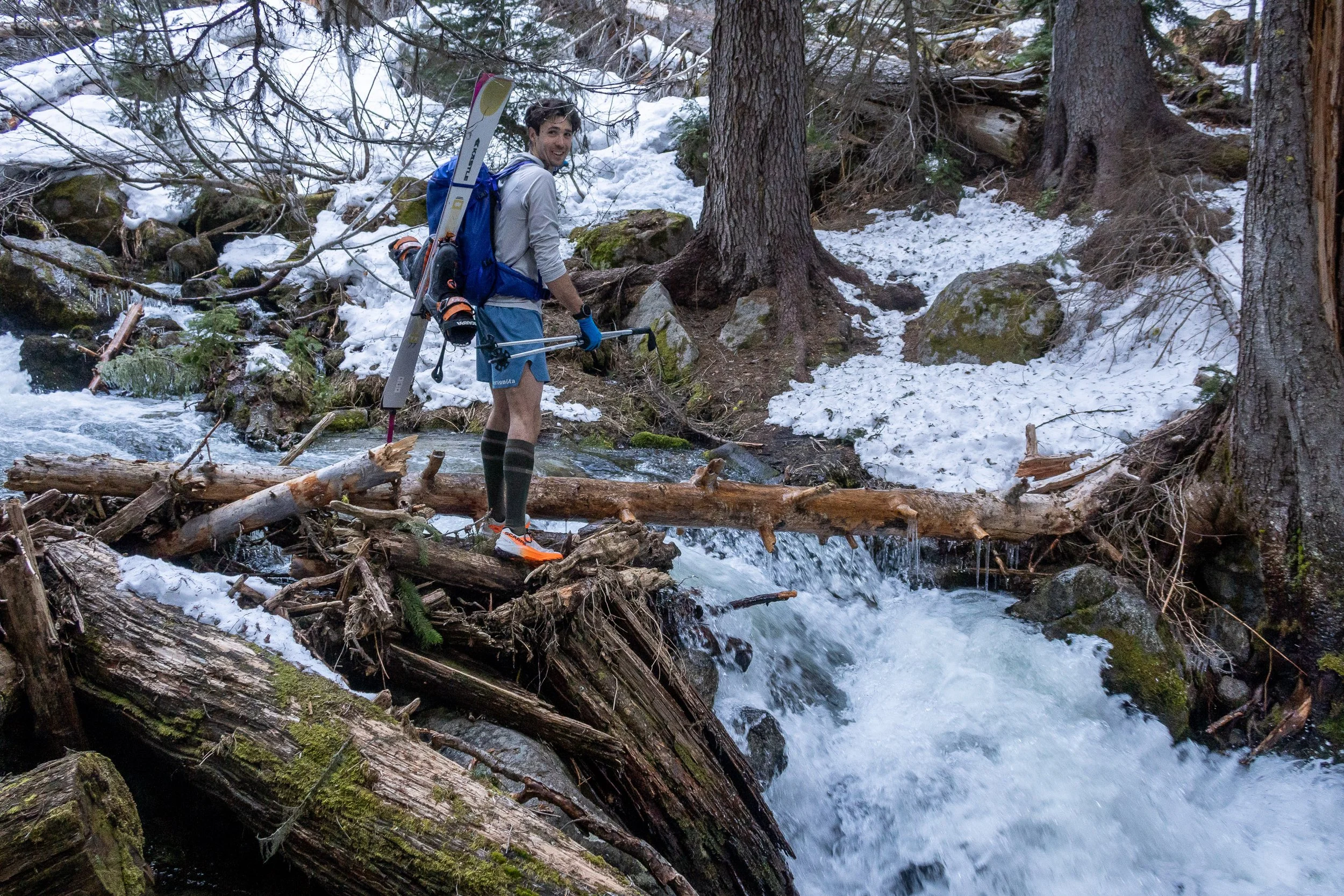 We set off from Leavenworth a little bit past 5am, having dropped my car at Cascade Meadows the night before. Our plan was to drive as far up the Icicle as possible until we got Matt’s truck stuck, and then pull out the skis - and that’s exactly what we did. We made it almost a mile past Johnny Creek, just over two miles shy of the Chatter Creek trailhead. We dug until we could get Matt’s truck off the road, then set off skinning just as it was starting to get light. We skinned for a pleasant five minutes, just past the first bend in the road, before (classically) encountering a completely bare stretch of road. We switched back to trail runners, strapped the skis on our packs, and contented ourselves with postholing all the way up the mostly snow covered road to Chatter Creek. The trail was mostly snow-free until the second creek crossing at around 4,300 feet.