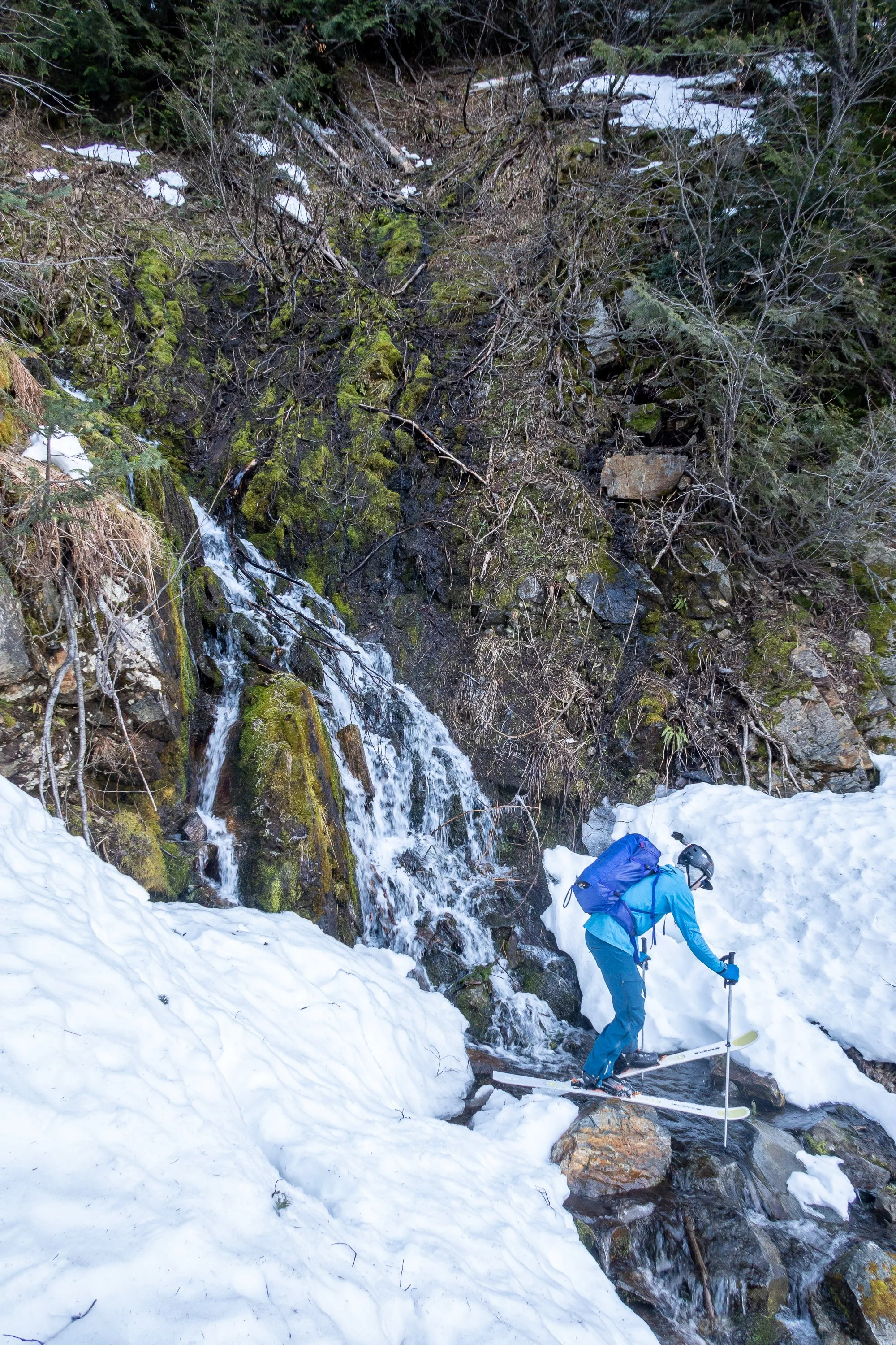 The Swath drops quite steeply down to Cascade Meadows from the northern end of a broad alpine plateau, and the contrast was quite stark. Behind us was gentle and sunny open slopes, and in front of us was the steep, shaded slide path that drops over 4,000 feet straight down. We dropped in, and, after a few intimidating first turns, we found our rhythm, skiing slopes that were more comically firm than scary. At 3,800 feet, we bailed out of the slide path onto the old logging road, now a mere 3.5 miles of easy road from the car - right? Of course not! Every few minutes of skiing were interrupted by bare patches, creek crossings, or downed logs that necessitated removing skis. Lower down, we decided to switch back to trail runners, thinking we were running out of snow, but the grass is always greener, and we were subjected to plenty of unpleasant post-holing. By the time we reached Whitepine Road I was so fed up with post-holing that I convinced Matt to put our skis back on, and we skied down the road, spending a fair share of the remining distance walking through a few inches of standing water on the road. Finally, just before sunset, we reached my car.