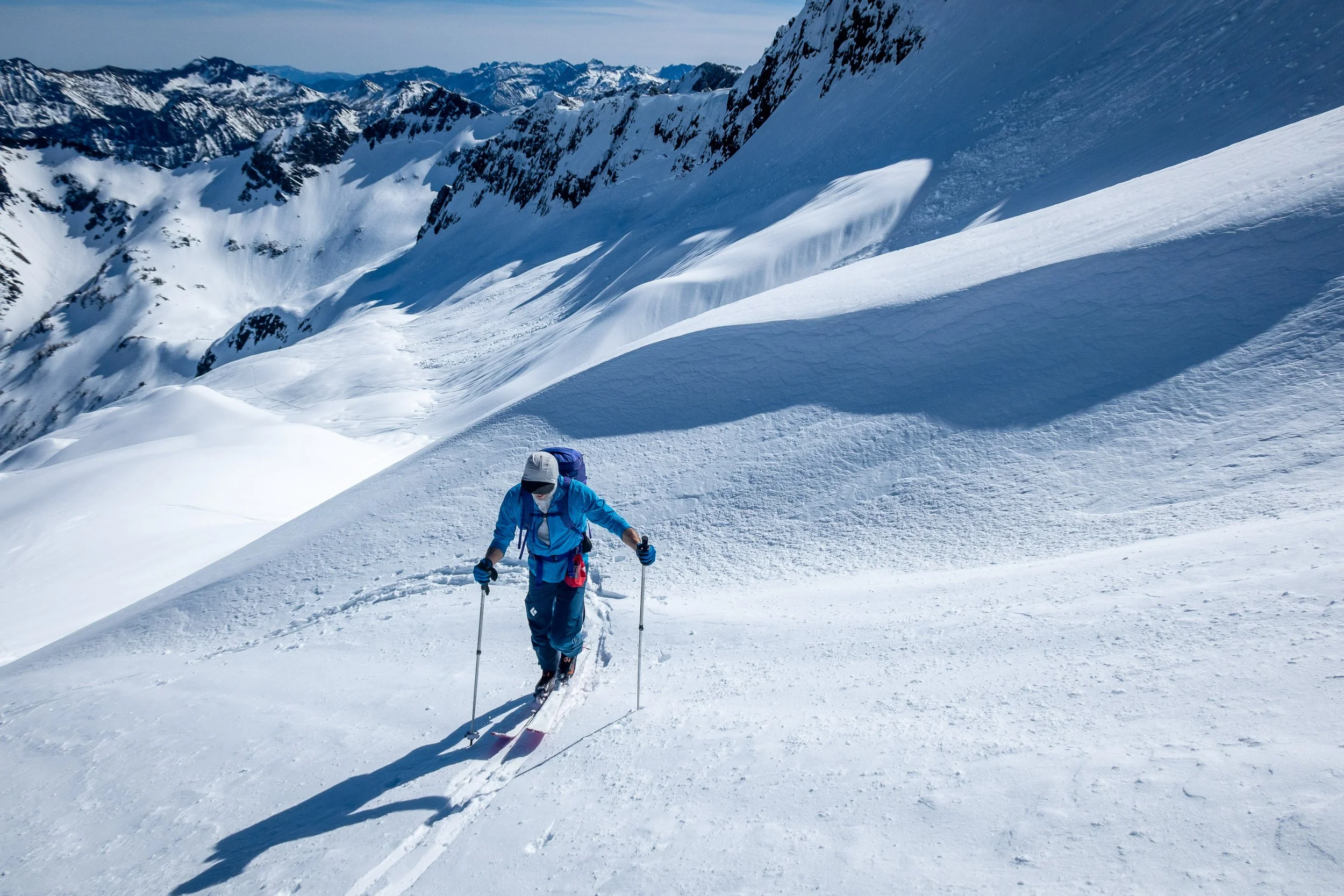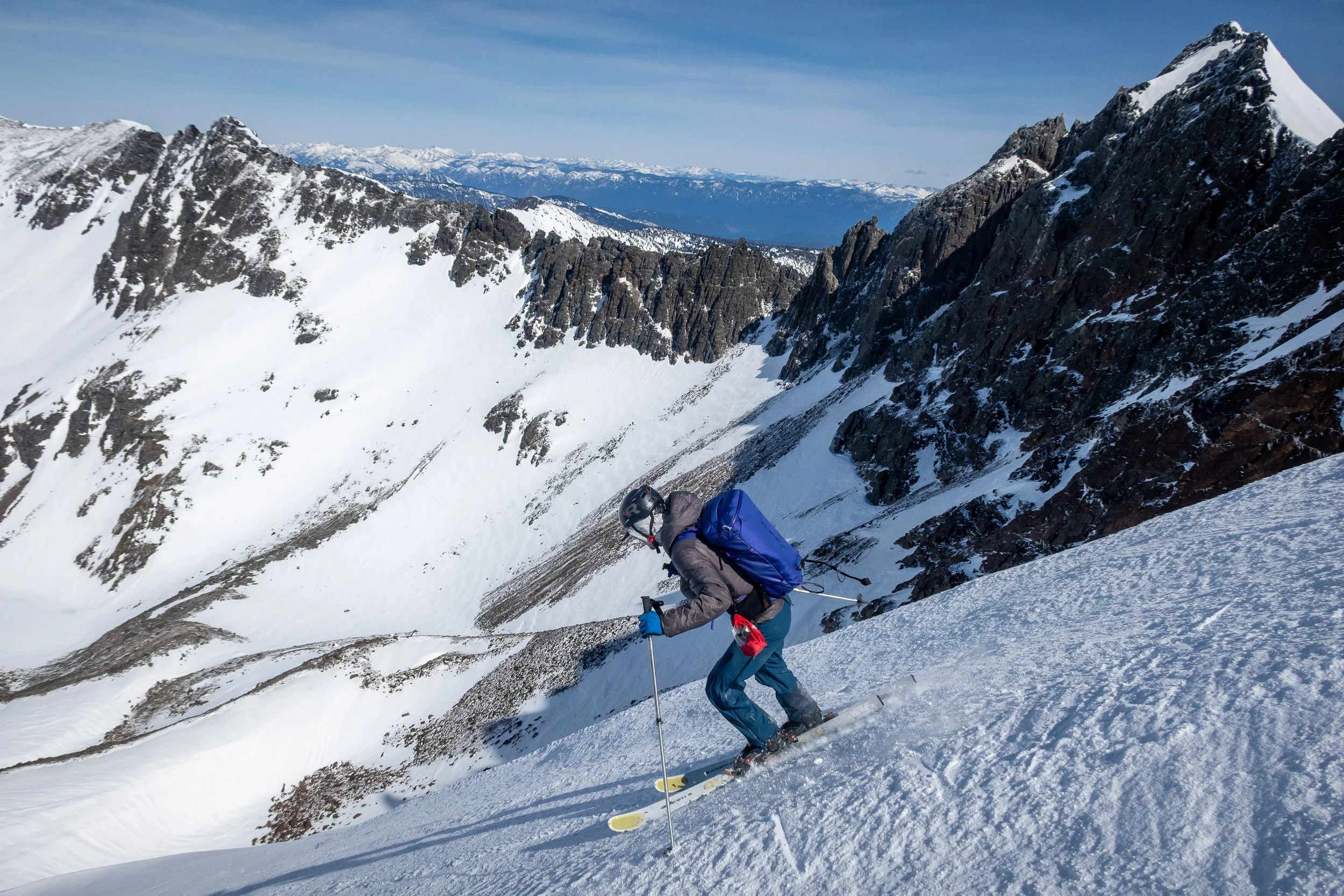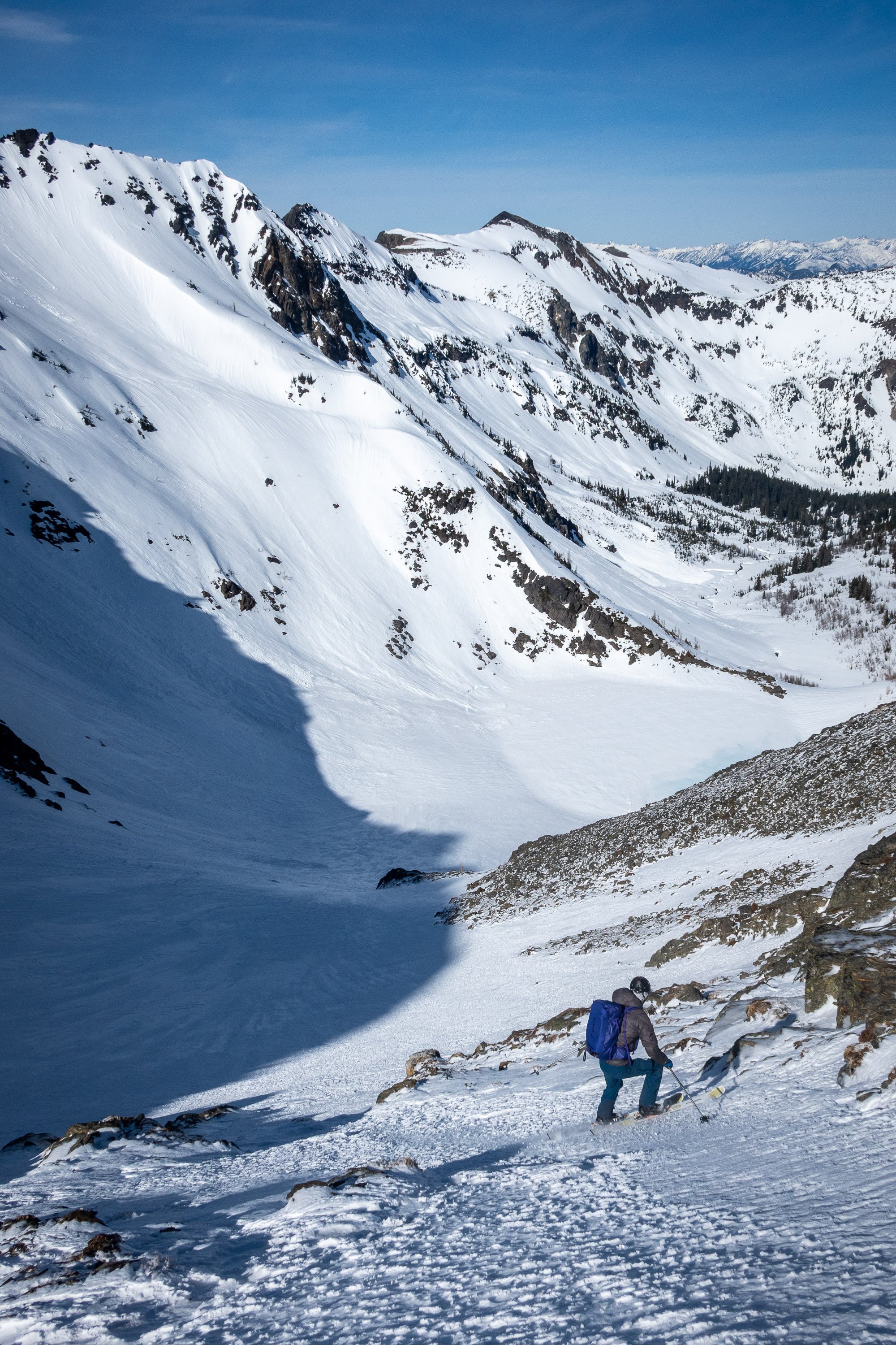 Matt dropping into the northern bowl on Snowgrass, with Big Chiwaukum in the distance. Our exit gully is at the sun-shade line directly above Matt’s backpack.