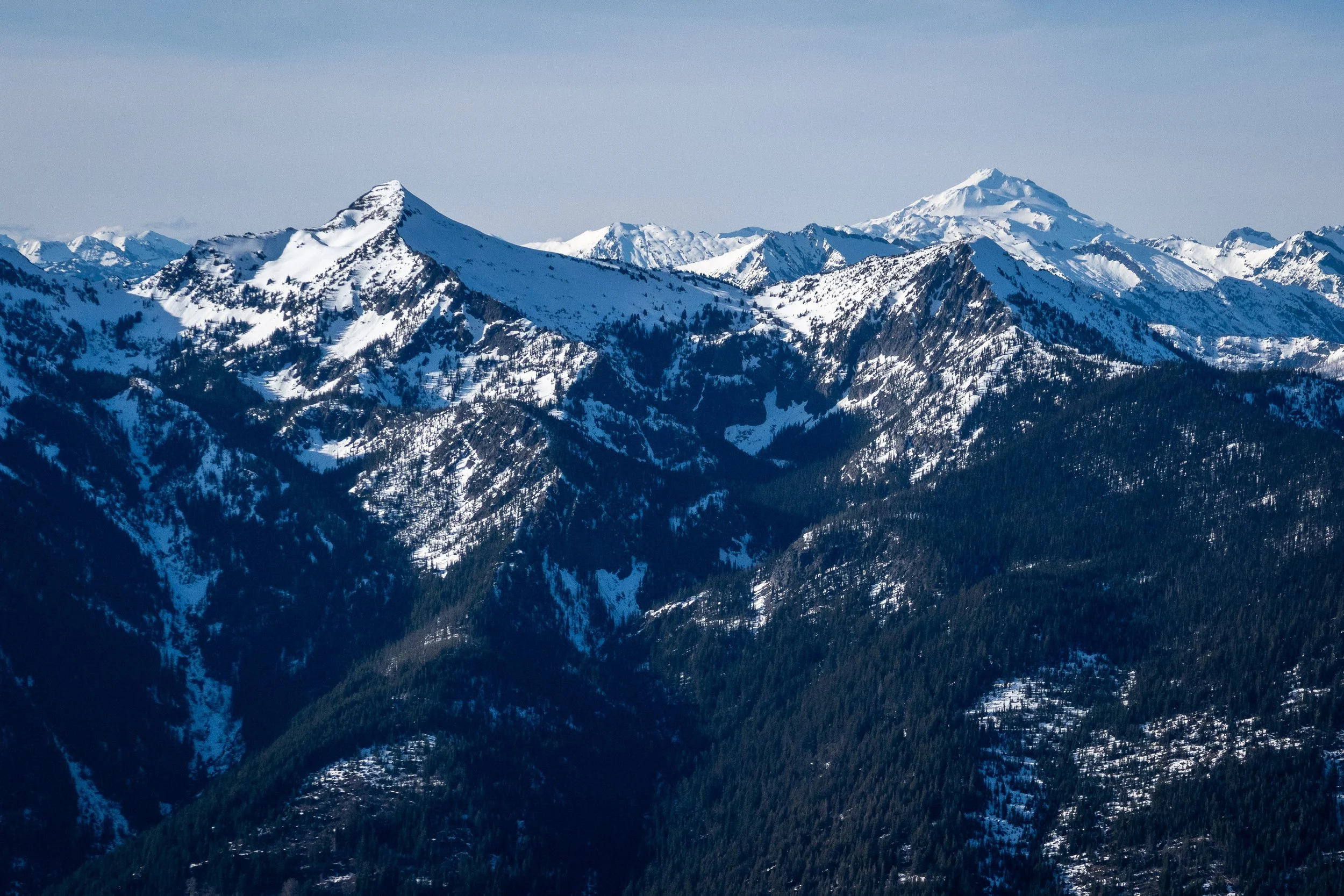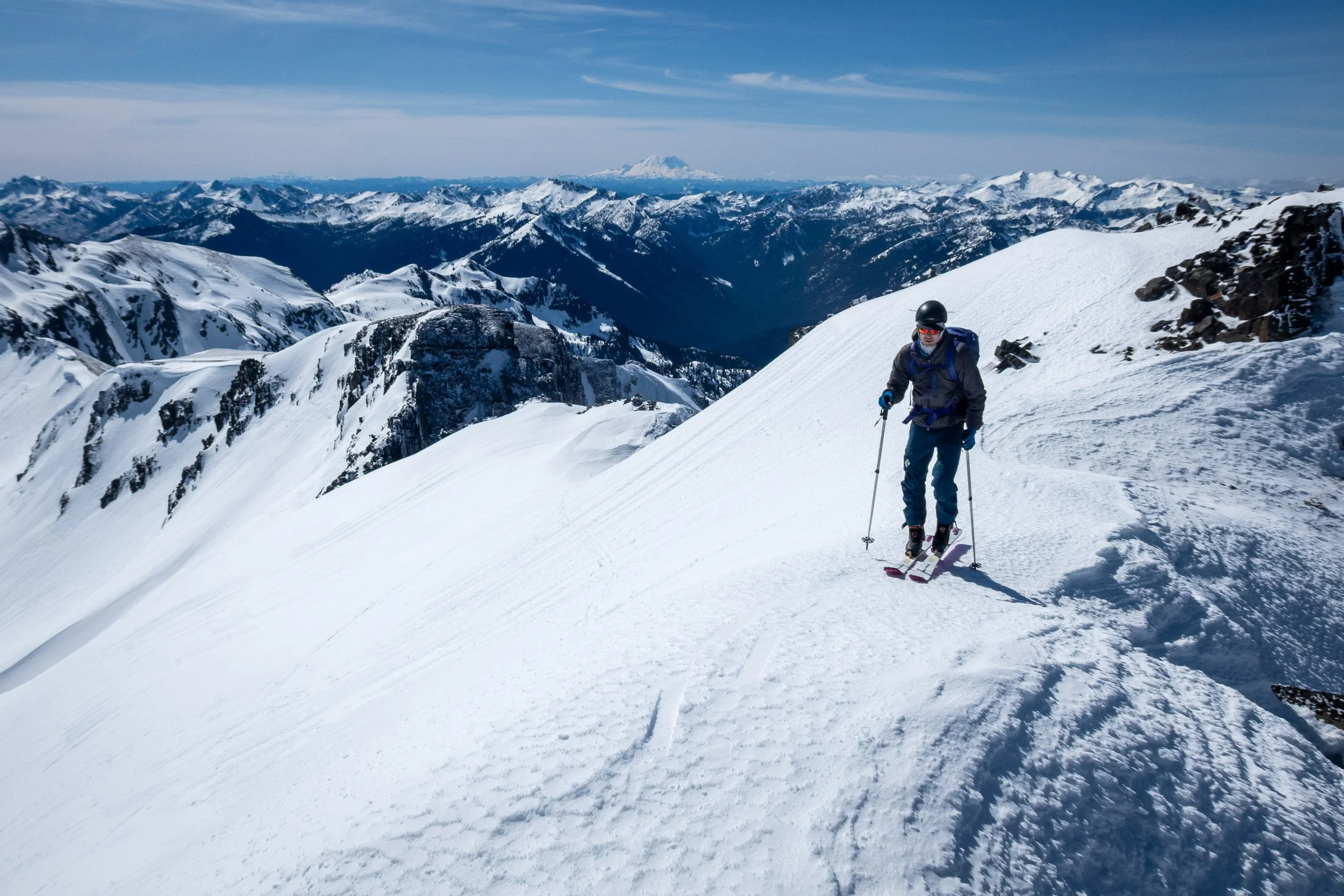 A nice view of Mount Howard and Mount Mastiff with Glacier Peak in the distance. We had skied from Rock Mountain (out of frame to the left) over Howard to Mastiff and beyond a few weeks earlier, so it was fun to get a view of our previous route.