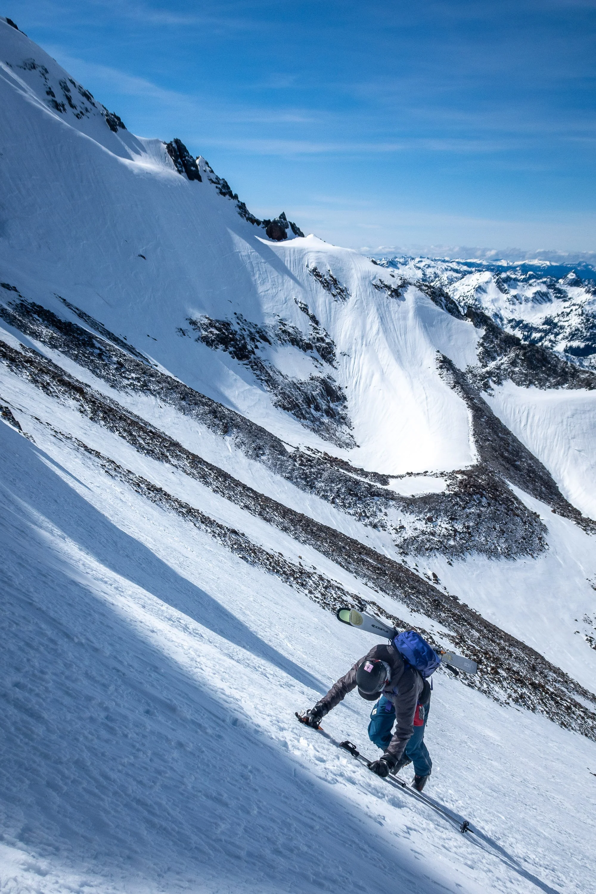 While the south side of Snowgrass was snowy and mellow, the steep bowl on the north side was steep, shaded, and surprisingly devoid of snow. We eyed our exit gully that would bring us back to the crest of the ridge between Snowgrass and Big Chiwaukum, and, with some care, found a spot to drop in. The skiing on the north side was very steep and outrageously firm - definite survival skiing, and decidedly not fun, despite the spectacular setting. After descending about 800 vertical feet towards Upper Grace Lake, we cut hard right to start our climb east. There was no way we were skinning the mixture of steep, bulletproof icy snow and frozen loose scree, so we strapped skis on our packs, grabbed out ice axes, and slowly booted our way towards the exit gully. We really ought to have brought boot crampons, given the poor conditions. The frozen scree ribs were especially unpleasant, with the rock and dirt encased in a slippery inch of ice. When you got your footing ostensibly secure, the ice would unexpectedly break, dumping you into a surprisingly loose spot of dirt and choss. Thankfully, the going nearer the gully was easier, and before long we hit the ridge crest and popped back into the sunshine and soft snow on the east side of the ridge.We ripped skins and traversed down to 7,200 feet to get below a steeper ridge, then climbed past some big old avalanche debris piles on easy terrain until we were just a hundred feet or so below the summit of Big Chiwaukum, right above the famous Big Chiwaukum Couloir.