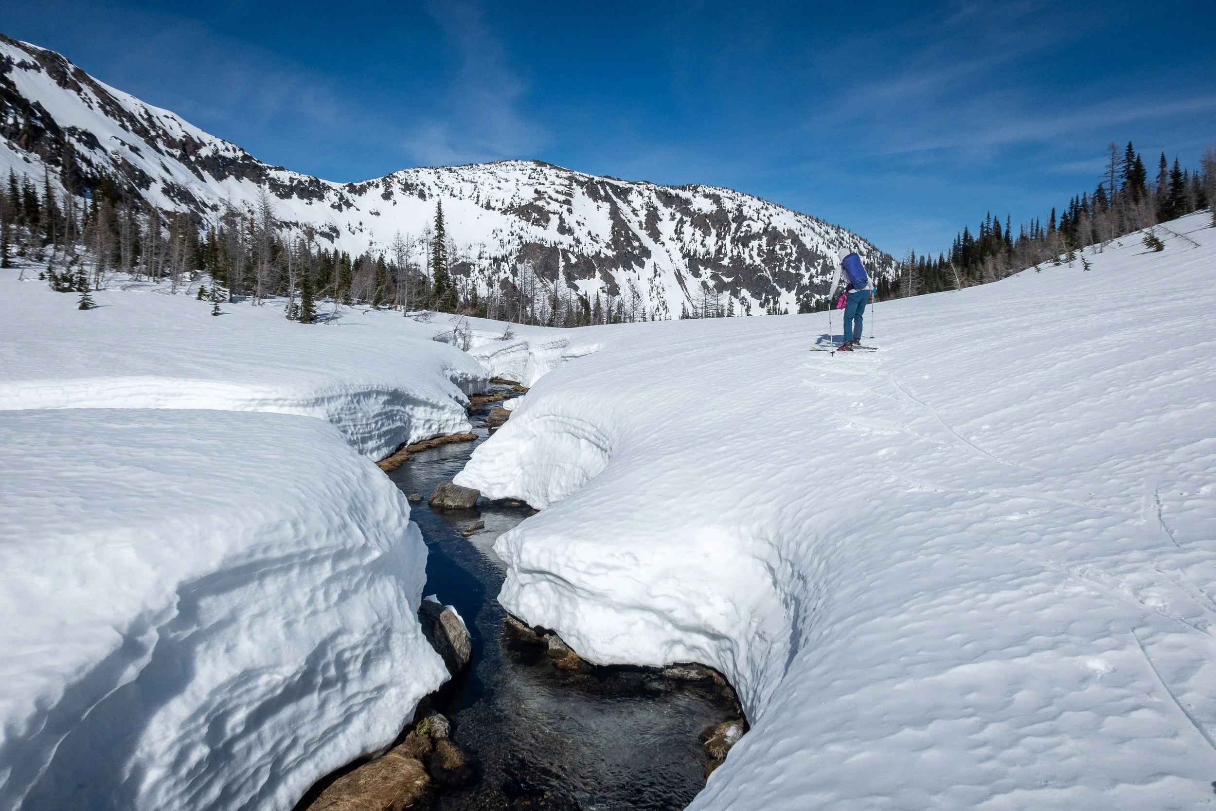 Skating alongside Chiwaukum Creek below Larch Lake. We exited over the notch above the creek at middle-left.