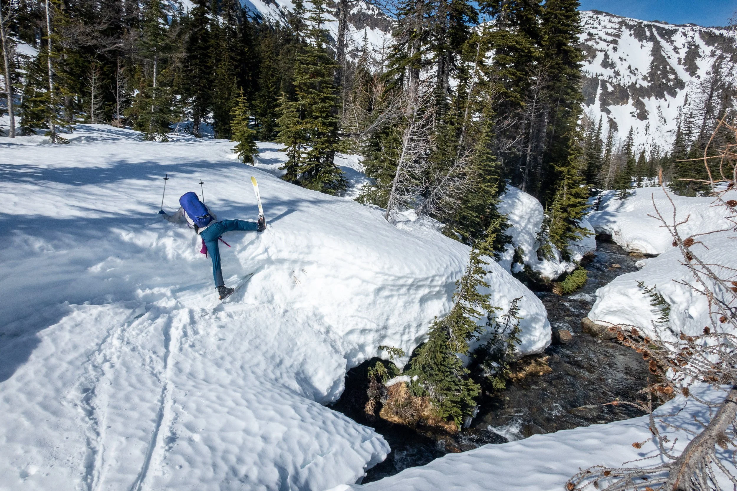 Matt surmounts the snowbank while crossing Chiwaukum Creek by obeying the “three points of contact rule”: two inverted ski poles and the tail of one ski.