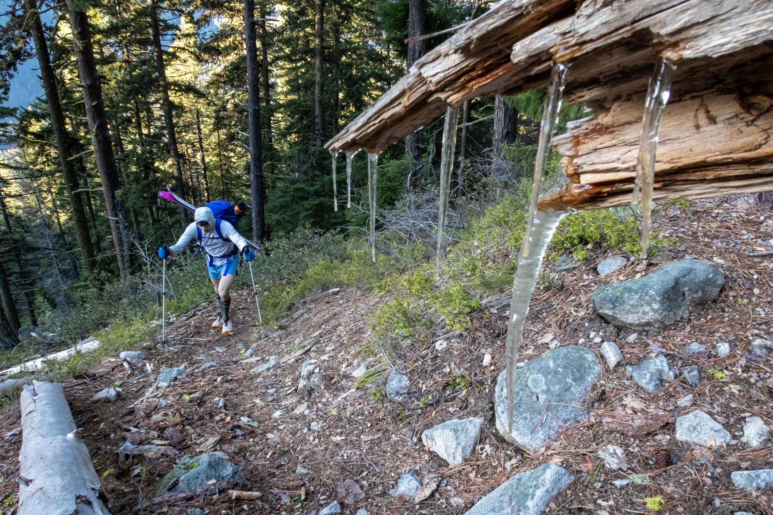 Matt, legs freed of their prisons/pants, charges up the Chatter Creek trail in the early morning, with some nice icicles on a fallen log.
