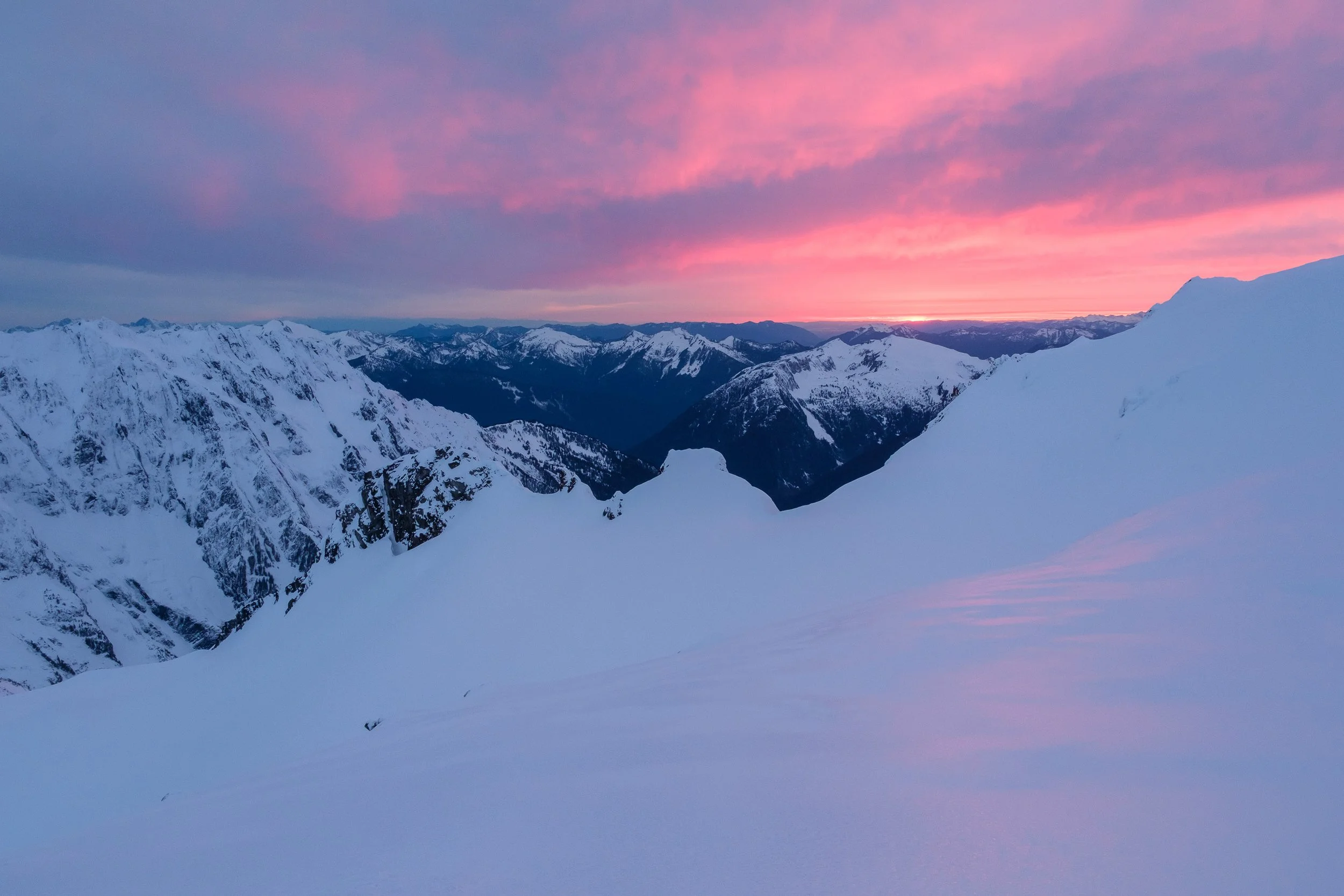 The weekend before last, I was antsy to get out and camp someplace pretty. I ended up heading up Sahale on skis for a quick overnight, camping just below the summit. It was a beautiful day when I left the car around noon, but some high clouds came in before sunset, making for more subdued light than I was hoping for. It was clear in the morning, but clouds to the east also blocked out much of the sunrise color. I was able to tag the summit of Sahale without much trouble, and just as I was reaching the top, the sun popped out above the clouds and lit up the mountains to the south. It was a special experience to have such a popular place to myself, and even with the clouds, it was still a stunning place to spend the night.